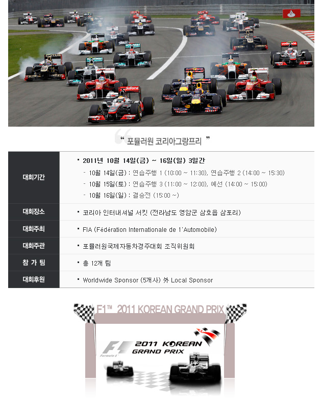 모든 드라이버들의 꿈인 F1 레이싱이 전남 영암에서 10월 14일 부터 개최됩니다. 2011 코리아 그랑프리 공식사이트 >> http://www.koreangp.kr