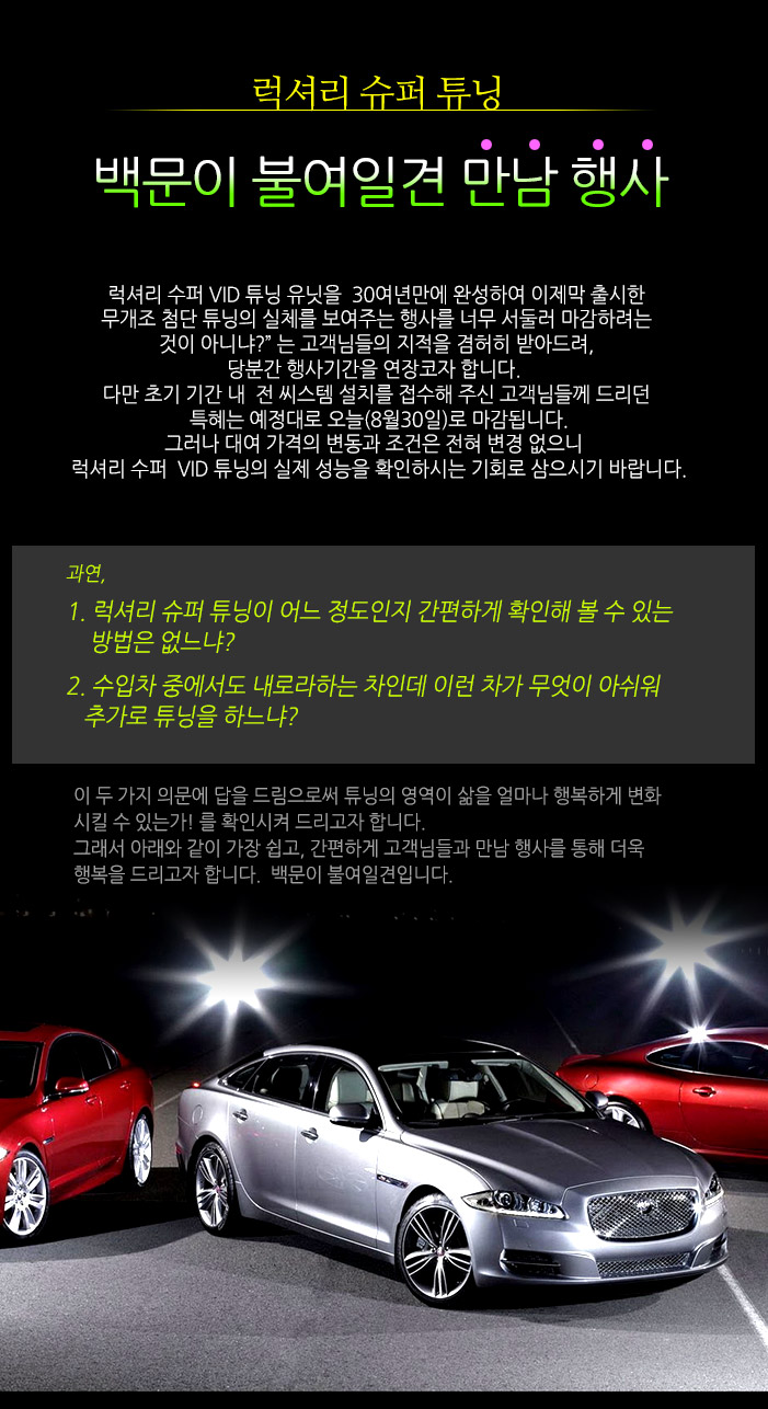 럭셔리 슈퍼 튜닝 백문이 불여일견 만남 행사 그 동안 럭셔리 슈퍼 튜닝 소개이후 VID System에 보내 주시는 고객님들의 성원과 관심에 감사드립니다.